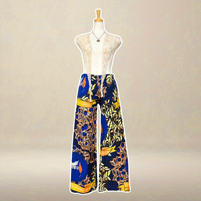 カラフルでパワフルな色柄のアフリカンテキスタイルを使ったパンツです。着けるだけで冴え渡り、エネルギーアップする感覚をお楽しみください✨ トレンドのワイドストレートライン、ゴムなのに着るとスッキリ見えるウエスト周りでスタイルアップを実現します。両サイドとヒップにポケットもあり実用性も高いデザインです。 日常から特別な1日まであなたらしさを表現するのにぴったりの一着です。 オリジナリティ溢れる、唯一無二のファッションを楽しみたい方におすすめです。 自分に自信を持ちたい方、雰囲気を明るくしたい日や気分アップしたい時にもおすすめです。 着るだけでトレンドを取り入れながらおしゃれを楽んでいただけます。 素材は綿100%となっており洗濯をして繰り返しお使いいただけます。 ユニセックスS〜Mサイズ 着丈100㎝、股下75cm、ウエスト74㎝、ヒップ108 ※Lサイズ作成可能です ※水通しをしておりますが洗濯の際は色落ちする場合がありますので2〜3回は他のものと別に洗うことをおすすめいたします ※1点ずつハンドメイドで制作しております、サイズの誤差はご了承くださいませ ※商品により色や柄の出方が異なる場合がございます、予めご了承くださいませ (HOME アフリカ布の説明をお読みくださいませ)